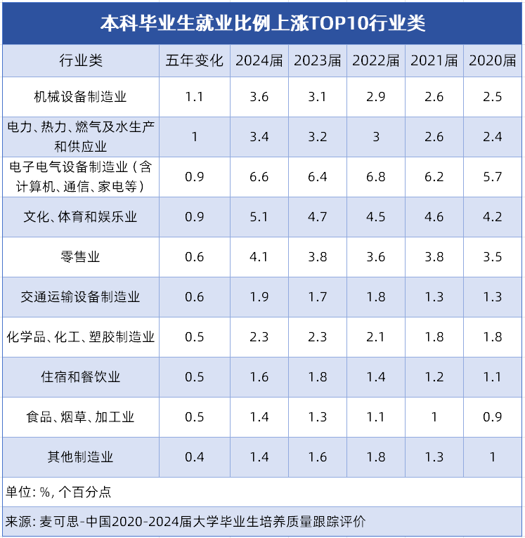 对于面对升学选择的高中生而言,领会当下及将来的就业趋向,找准那些人才需求兴旺、成长潜力凸起的行业,能让专业选择更具前瞻性。近五年,我国本科结业生就业市场一批行业类凭仗强劲的成长动力,成为吸纳结业生的主要阵地。接下来小优将为你细致解读就业比例上涨TOP10行业类,找准适配的专业标的目的,为你的升学规划供给参考。 这10个行业类的分布特征明显:制制业相关行业占领从导,涵盖机械设备、电子电气设备等多个细分范畴,占TOP10中的6席。这一态势表现了我国制制业转型升级成效,高端配备制制、电子消息等焦点范畴对专业本科人才需求兴旺。同时,能源保障、消费升级、平易近生办事等类行业的稳步增加,也为大师将来职业选择供给了更多元标的目的,这些增加显著行业对应的专业范畴,值得沉点关心。机械设备制制业是支持国平易近经济成长的主要根本财产,当前正加快向高端化、智能化、绿色化转型,笼盖工业出产、根本设备扶植等多个环节范畴,高端配备制制、细密仪器研发等标的目的对本科手艺人才的需求持续攀升。该专业是机械类的保守王牌专业,焦点是培育控制机械设想、制制工艺和从动化节制等分析能力的手艺人才。学生将进修若何设想合适需求的机械产物,优化出产工艺流程,处理出产中的手艺难题,具备从产物研发到出产落地的全流程参取能力。报考需具备结实数学、物理根本,力学学问尤为环节。升入大学后需注沉实践,积极参取尝试、工业练习取学科竞赛,考取CAD工程师认证提拔合作力。就业面广,可入职汽车制制、工程机械、航空航天等企业,处置机械设想、工艺、设备办理等岗亭,需留意部门岗亭需驻厂或深切车间,工做相对艰辛,做息需贴合出产节拍, 做为一门融合机械工程、从动化手艺、计较机科学的交叉学科,智能制制工程专业,聚焦于数字化工场扶植和智能配备研发,旨正在培育可以或许使用先辈手艺对保守出产模式进行升级主要根本财产,渗入于出产糊口各范畴。近年来正在精细化工财产沉点搀扶、新材料手艺立异鞭策下,行业正向高端化、绿色化转型,新材料研发、保守产物升级等需求,为本科手艺人才供给了不变且有潜力的就业平台。 该专业是化工行业的焦点专业,培育控制化学工程道理、化工工艺设想、化学反映工程、学生将具备化工出产流程设想、工艺优化、产质量量节制、化工设备研发等分析能力,报考需结实化学、数学根本,沉点控制无机化学、无机化学学问。大学进修中注沉尝试取练习,参取化工出产练习、工艺设想项目堆集经验,树立绿色化工取平安出产。就业可入职中石化、及精细化工、新材料企业,处置工艺工程师、出产手艺办理、产物研发等岗亭,也可进入环保部分担任化工废水、废气处置,职业笼盖面广,不变性强。