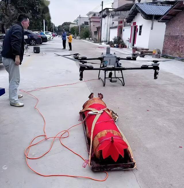 老表用无人机吊着猪的四肢,间接飞升上山,过去20分钟的山,现正在一分钟就送到了。无人机载沉250斤,猪有180斤,悄悄一吊就起来了。 土葬不像城里有墓园,每家每户都有本人选定的地址,这就导致了良多处所不太好走,像修碑修坟这种“沉活儿”,让无人机吊过去,几乎是最完满的解。