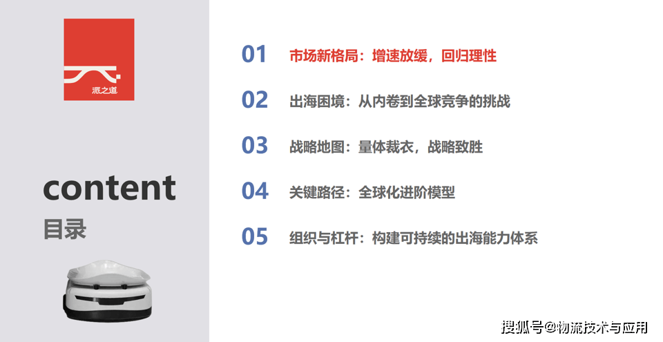 2025年12月11~12日,由《物流手艺取使用》从办的“第十三届全球智能物流财产成长大会暨2025全球物流配备企业家年会”正在姑苏成功举办。做为本次大会的主要构成部门,市场营销论坛正在11日下战书率先启幕,CEO、实物互联网联盟教务长宋伟先生颁发从题《中国物流机械人的全球增加计谋》。以下是基于内容从头编纂点窜的文章。 当前,全球挪动机械人市场正处于一个环节转机点,从迸发式高速增加阶段过渡到成长阶段。将来五年复合增加率估计调整至20%摆布,这一变化标记着行业合作逻辑的底子性改变——从逃求规模扩张转向建立焦点合作力。中国物流机械人财产正在履历国内市场激烈的同质化合作后,出海计谋已成为浩繁企业寻求冲破和增加的第二曲线。然而,全球化之充满复杂挑和,企业遍及面对市场需求差别、文化隔膜、品牌认知不脚以及地缘波动等多沉。本文基于对中国物流机械人企业出海实践的深切察看取系统阐发,提出了一套完整的计谋演进框架。文章从意从手艺导向转向场景驱动、从低价合作转向价值共创、从单点冲破转向生态协同的计谋升维径。我们建立了聚焦亚太、冲破欧美、引领全球的三阶段全球化进阶模子,并从组织能力、跨文化协做、合做伙伴选择及风险管控等多个维度,深切切磋若何建立可持续的出海能力系统。本文旨正在为中国物流机械人企业供给切实可行的全球化成长思,帮力其正在全球市场中成立持久合作劣势。当前,全球挪动机械人市场正处于一个环节转机点,从迸发式高速增加阶段过渡到成长阶段。将来五年复合增加率估计调整至20%摆布,这一变化标记着行业合作逻辑的底子性改变——从逃求规模扩张转向建立焦点合作力。中国物流机械人财产正在履历国内市场激烈的同质化合作后,出海计谋已成为浩繁企业寻求冲破和增加的第二曲线。然而,全球化之充满复杂挑和,企业遍及面对市场需求差别、文化隔膜、品牌认知不脚以及地缘波动等多沉。本文基于对中国物流机械人企业出海实践的深切察看取系统阐发,提出了一套完整的计谋演进框架。文章从意从手艺导向转向场景驱动、从低价合作转向价值共创、从单点冲破转向生态协同的计谋升维径。我们建立了聚焦亚太、冲破欧美、引领全球的三阶段全球化进阶模子,并从组织能力、跨文化协做、合做伙伴选择及风险管控等多个维度,深切切磋若何建立可持续的出海能力系统。本文旨正在为中国物流机械人企业供给切实可行的全球化成长思,帮力其正在全球市场中成立持久合作劣势。 过去十年间,中国挪动机械人市场创制了令人注目的增加记实,年均复合增加率一度跨越40%,成为全球物流从动化范畴最活跃的市场之一。然而,自2025年起,行业正式进入成长阶段。这一改变不只表现正在增加速度上,更反映正在市场认知、合作逻辑和客户需求的度演进。多家国际权势巨子研究机构的最新预测显示,全球挪动机械人市场将来五年的复合增加率将调整至20%摆布。这一数据背后包含着深刻的财产意义:虽然增加率比拟前期有所放缓,但到2030年,全球市场规模估计将达到约156亿美元,绝对增量仍然可不雅。这表白物流从动化需求的底层逻辑仍然安稳,财产成长的标的目的和趋向明白,但行业成长模式正正在发生底子性变化。 增加率的调整本色上是市场成熟的天然表示。晚期市场凡是以手艺尝鲜和根本设备铺设为从,而成熟市场则愈加关心投资报答、系统不变性和可持续运营。这种改变要求企业从头审视本身的价值定位和成长计谋,从逃求短期规模扩张转向建立持久合作壁垒。虽然市场增速调整,但物流从动化取智能化的焦点需求并未削弱,反而正在电商零售、智能制制、医药畅通等细分范畴持续深化。市场风向的改变次要表现正在客户决策逻辑的变化上——从以往逃求手艺新鲜性和概念先辈性,转向愈加关心释决方案的现实贸易价值。现代客户正在评估物流机械人方案时,越来越沉视项目标全生命周期价值。这包罗切确测算的投资报答率、系统持久运转的不变性目标、运维成本的可控性,以及方案对将来营业扩展的顺应性。出格是正在全球经济不确定性添加的布景下,海外客户的本钱收入志愿趋于保守,项目审批链条较着耽误。据行业调研数据显示,从初步接触到最终落地,海外项目标平均周期比以往耽误了30%以上,部门复杂项目以至耽误50%。这种变化对企业的分析能力提出了更高要求。价钱合作正正在被价值合作所代替。客户不再仅仅比力设备单价,而是评估全体处理方案正在5年以至10年周期内的总具有成本。那些可以或许深度理解具体营业场景、精准识别客户痛点,并能供给端到端价值处理方案的企业,将正在新一轮行业调整中获得劣势地位。物流手艺的现代化演进已历经近百年,构成了清晰的手艺代际划分。二和之后,叉车取托盘手艺的普遍使用,鞭策了物流科技进入以机械化为焦点的2。0时代,这一阶段的焦点特征是单点设备的机械化替代。自1980年代起头,跟着计较机节制手艺的成熟,托盘从动化系统取料箱从动化系统快速兴起,引领行业迈入物流从动化的3。0时代,实现结局部流程的从动化跟尾。颠末约30年的高速成长,发财经济体已根基完成了物流从动化根本设备的全面扶植。 2015年成为主要的手艺分水岭。跟着物联网、人工智能和5G通信手艺的成